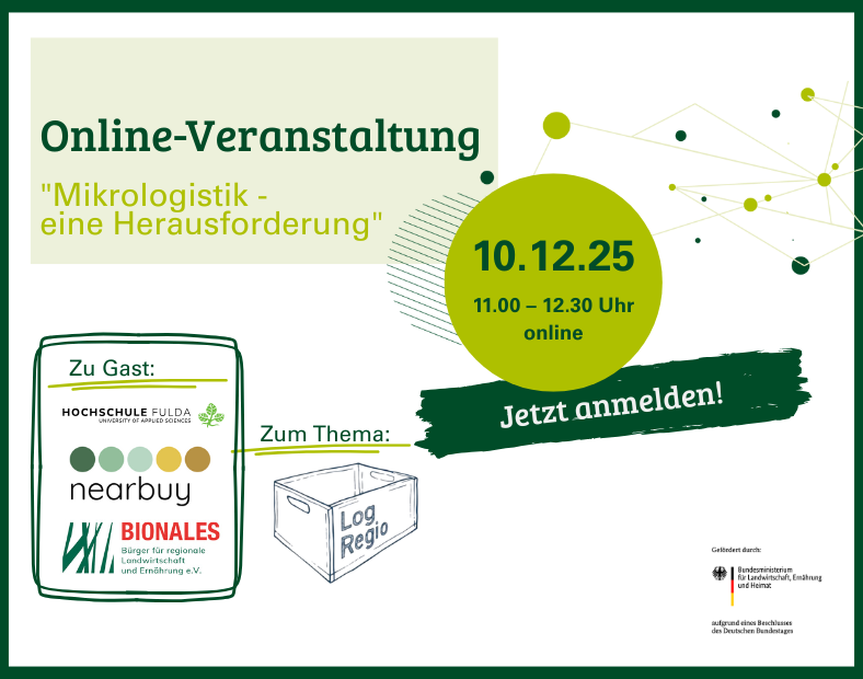 Der Bundesverband der Regionalbewegung e.V. lädt daher das Team der Hochschule Fulda am House of Logistics and Mobility (HOLM) in Frankfurt gemeinsam mit BIONALES e. V. und nearbuy ein, um dem REGIOlogistik-Netzwerk die zentralen Ergebnisse des "LogRegio"-Projekts zu präsentieren – praxisnah und bundesweit nutzbar.