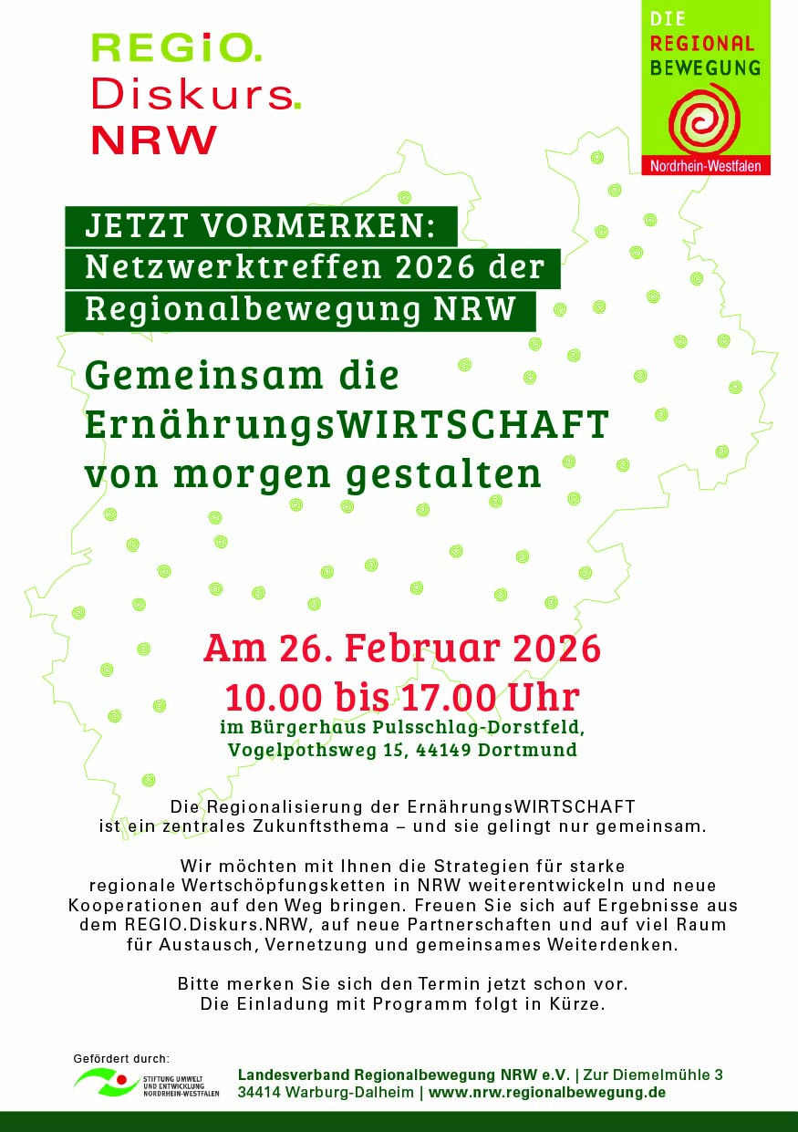 Der Landesverband Regionalbewegung NRW e.V. lädt Akteurinnen und Akteure der Ernährungswirtschaft zum landesweiten Netzwerktreffen ein. Im Fokus stehen die Regionalisierung der Wertschöpfung, der Aufbau belastbarer Kooperationen sowie Impulse aus dem Projekt Regio.Diskurs.NRW. Geplant sind kurze Pitch-Sessions aus dem Netzwerk und thematische Workshops rund um Wirtschaftsförderung, Tourismus, Regionalvermarktung und Lebensmittelhandwerk im REGIOwez.