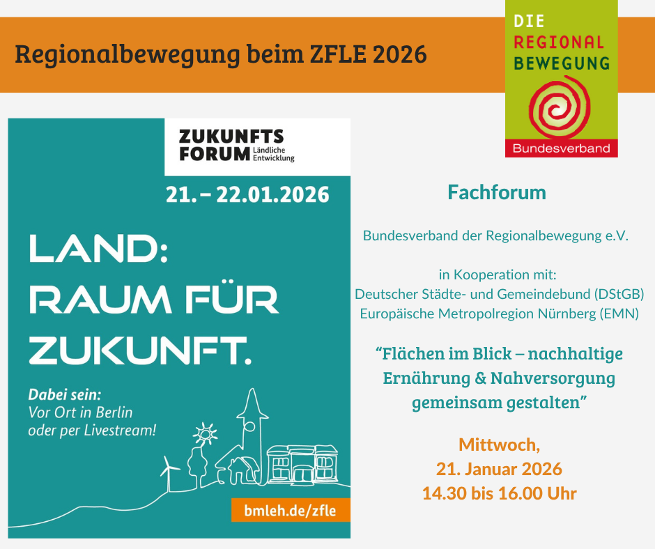 Auch der Bundesverband der Regionalbewegung e.V. ist mit dabei und bietet mit dem Fachforum "Flächen im Blick – nachhaltige Ernährung & Nahversorgung gemeinsam gestalten" einen wichtigen Input und die Möglichkeit zum Austausch.