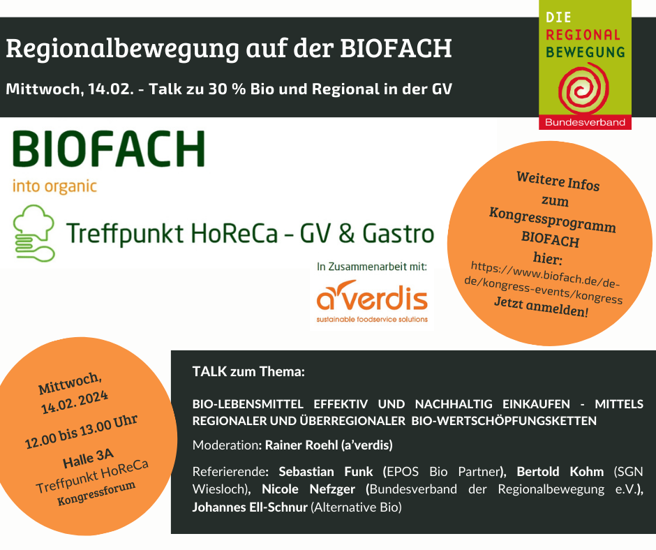 Die Talkrunde, bei der u.a. Nicole Nefzger, Geschäftsführerin der Regionalbewegung, dabei sein wird,  möchte viele Beispiele und Tipps für den erfolgreichen regionalen Bio-Einkauf geben und diskutieren.